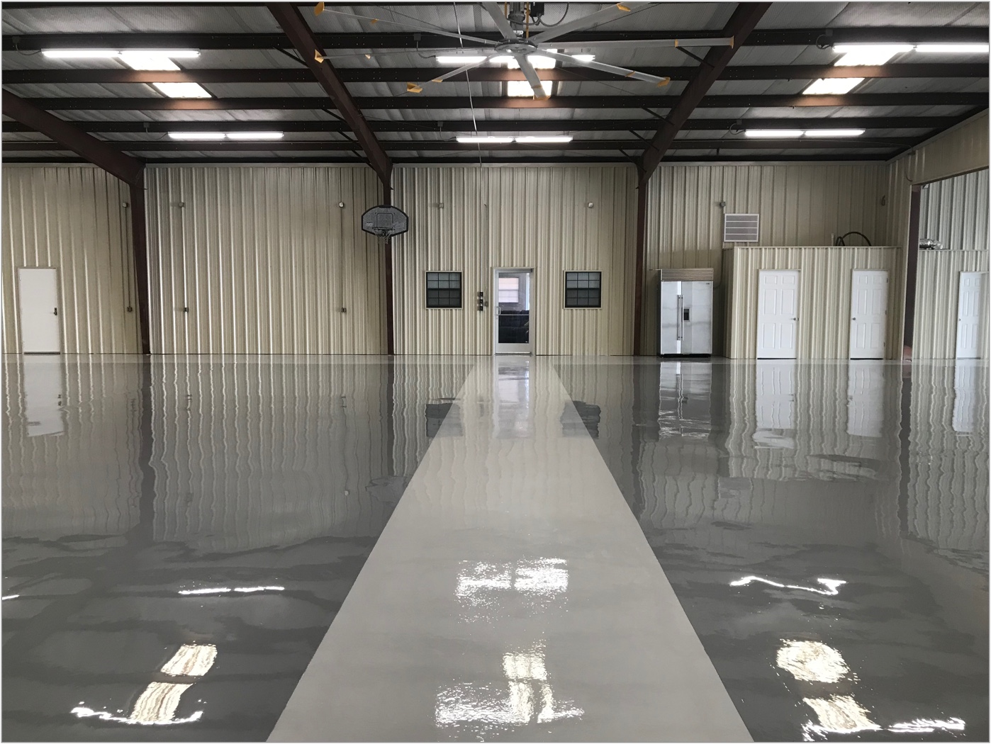 This makes the aesthetics second to none and mechanical repairs optimal with additional brightness of the entire hangar. While most hangar owners like and opt for a smooth epoxy coating to make clean-up easy and to create that showroom appeal, some owners may prefer a more slip resistant surface. We can create this as well.